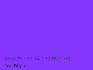 XYZ 29.089,14.939,95.958 Color is a light violet color and the nearest color is Blue Violet #8a2be2. Hex code #8537ff and RGB value is rgb(133,55,255). In RGB color space, this color is composed of 52% red, 22% green, 100% blue, In CMYK color space, this color is composed of 48% cyan, 78% magenta, 0% yellow , 0% black , In HSL color space, this color has a hue angle of 263° , 100% saturation and 61% lightness.