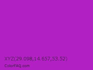 XYZ 29.098,14.657,53.52 Color is a normal magenta color and the nearest color is Steel Pink #cc33cc. Hex code #b321c4 and RGB value is rgb(179,33,196). In RGB color space, this color is composed of 70% red, 13% green, 77% blue, In CMYK color space, this color is composed of 9% cyan, 83% magenta, 0% yellow , 23% black , In HSL color space, this color has a hue angle of 294° , 71% saturation and 45% lightness.