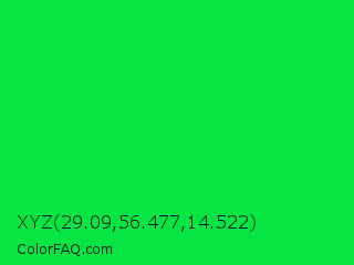 XYZ 29.09,56.477,14.522 Color is a normal green color and the nearest color is Malachite #0bda51. Hex code #07e542 and RGB value is rgb(7,229,66). In RGB color space, this color is composed of 3% red, 90% green, 26% blue, In CMYK color space, this color is composed of 97% cyan, 0% magenta, 71% yellow , 10% black , In HSL color space, this color has a hue angle of 136° , 94% saturation and 46% lightness.