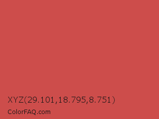 XYZ 29.101,18.795,8.751 Color is a normal red color and the nearest color is English Vermillion #cc474b. Hex code #cd4d4b and RGB value is rgb(205,77,75). In RGB color space, this color is composed of 80% red, 30% green, 29% blue, In CMYK color space, this color is composed of 0% cyan, 62% magenta, 63% yellow , 20% black , In HSL color space, this color has a hue angle of 1° , 57% saturation and 55% lightness.