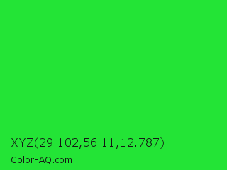 XYZ 29.102,56.11,12.787 Color is a normal green color and the nearest color is Lime Green #32cd32. Hex code #23e436 and RGB value is rgb(35,228,54). In RGB color space, this color is composed of 14% red, 89% green, 21% blue, In CMYK color space, this color is composed of 85% cyan, 0% magenta, 76% yellow , 11% black , In HSL color space, this color has a hue angle of 126° , 78% saturation and 52% lightness.