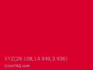 XYZ 29.108,14.949,3.936 Color is a normal red color and the nearest color is Medium Candy Apple Red #e2062c. Hex code #d9002e and RGB value is rgb(217,0,46). In RGB color space, this color is composed of 85% red, 0% green, 18% blue, In CMYK color space, this color is composed of 0% cyan, 100% magenta, 79% yellow , 15% black , In HSL color space, this color has a hue angle of 347° , 100% saturation and 43% lightness.