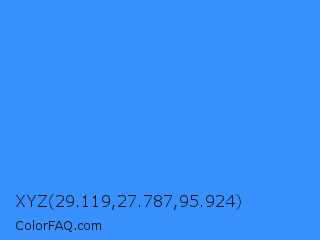 XYZ 29.119,27.787,95.924 Color is a normal blue color and the nearest color is Brilliant Azure #3399ff. Hex code #3790fc and RGB value is rgb(55,144,252). In RGB color space, this color is composed of 22% red, 56% green, 99% blue, In CMYK color space, this color is composed of 78% cyan, 43% magenta, 0% yellow , 1% black , In HSL color space, this color has a hue angle of 213° , 97% saturation and 60% lightness.
