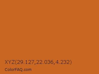 XYZ 29.127,22.036,4.232 Color is a normal orange color and the nearest color is Piper #c96323. Hex code #c96622 and RGB value is rgb(201,102,34). In RGB color space, this color is composed of 79% red, 40% green, 13% blue, In CMYK color space, this color is composed of 0% cyan, 49% magenta, 83% yellow , 21% black , In HSL color space, this color has a hue angle of 24° , 71% saturation and 46% lightness.