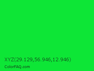 XYZ 29.129,56.946,12.946 Color is a normal green color and the nearest color is Vivid Malachite #00cc33. Hex code #0de636 and RGB value is rgb(13,230,54). In RGB color space, this color is composed of 5% red, 90% green, 21% blue, In CMYK color space, this color is composed of 94% cyan, 0% magenta, 77% yellow , 10% black , In HSL color space, this color has a hue angle of 131° , 89% saturation and 48% lightness.