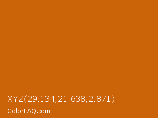 XYZ 29.134,21.638,2.871 Color is a normal orange color and the nearest color is Red Stage #d05f04. Hex code #cb6308 and RGB value is rgb(203,99,8). In RGB color space, this color is composed of 80% red, 39% green, 3% blue, In CMYK color space, this color is composed of 0% cyan, 51% magenta, 96% yellow , 20% black , In HSL color space, this color has a hue angle of 28° , 92% saturation and 41% lightness.