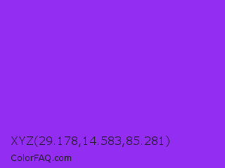 XYZ 29.178,14.583,85.281 Color is a normal purple color and the nearest color is Veronica #a020f0. Hex code #942df2 and RGB value is rgb(148,45,242). In RGB color space, this color is composed of 58% red, 18% green, 95% blue, In CMYK color space, this color is composed of 39% cyan, 81% magenta, 0% yellow , 5% black , In HSL color space, this color has a hue angle of 271° , 88% saturation and 56% lightness.