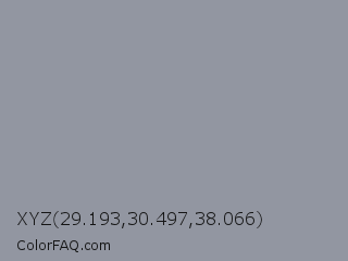 XYZ 29.193,30.497,38.066 Color is a normal blue color and the nearest color is Manatee Crayola #8d90a1. Hex code #9296a1 and RGB value is rgb(146,150,161). In RGB color space, this color is composed of 57% red, 59% green, 63% blue, In CMYK color space, this color is composed of 9% cyan, 7% magenta, 0% yellow , 37% black , In HSL color space, this color has a hue angle of 224° , 7% saturation and 60% lightness.