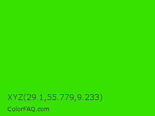 XYZ 29.1,55.779,9.233 Color is a normal green color and the nearest color is Harlequin #3fff00. Hex code #38e300 and RGB value is rgb(56,227,0). In RGB color space, this color is composed of 22% red, 89% green, 0% blue, In CMYK color space, this color is composed of 75% cyan, 0% magenta, 100% yellow , 11% black , In HSL color space, this color has a hue angle of 105° , 100% saturation and 45% lightness.