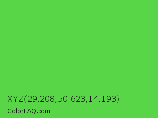 XYZ 29.208,50.623,14.193 Color is a normal green color and the nearest color is Lime Green #32cd32. Hex code #58d647 and RGB value is rgb(88,214,71). In RGB color space, this color is composed of 35% red, 84% green, 28% blue, In CMYK color space, this color is composed of 59% cyan, 0% magenta, 67% yellow , 16% black , In HSL color space, this color has a hue angle of 113° , 64% saturation and 56% lightness.