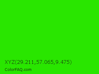 XYZ 29.211,57.065,9.475 Color is a normal green color and the nearest color is Harlequin #3fff00. Hex code #29e600 and RGB value is rgb(41,230,0). In RGB color space, this color is composed of 16% red, 90% green, 0% blue, In CMYK color space, this color is composed of 82% cyan, 0% magenta, 100% yellow , 10% black , In HSL color space, this color has a hue angle of 109° , 100% saturation and 45% lightness.