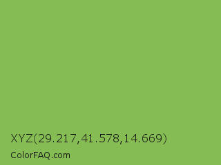 XYZ 29.217,41.578,14.669 Color is a normal green color and the nearest color is Dollar Bill #85bb65. Hex code #85bc53 and RGB value is rgb(133,188,83). In RGB color space, this color is composed of 52% red, 74% green, 33% blue, In CMYK color space, this color is composed of 29% cyan, 0% magenta, 56% yellow , 26% black , In HSL color space, this color has a hue angle of 91° , 44% saturation and 53% lightness.
