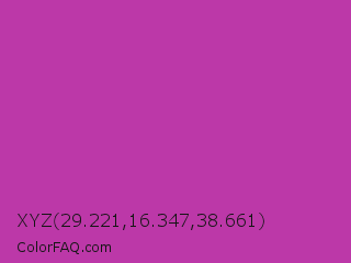 XYZ 29.221,16.347,38.661 Color is a normal magenta color and the nearest color is Byzantine #bd33a4. Hex code #bc38a8 and RGB value is rgb(188,56,168). In RGB color space, this color is composed of 74% red, 22% green, 66% blue, In CMYK color space, this color is composed of 0% cyan, 70% magenta, 11% yellow , 26% black , In HSL color space, this color has a hue angle of 309° , 54% saturation and 48% lightness.