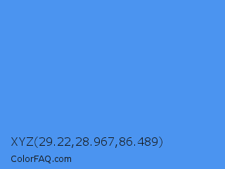 XYZ 29.22,28.967,86.489 Color is a light blue color and the nearest color is Blueberry #4f86f7. Hex code #4b94f0 and RGB value is rgb(75,148,240). In RGB color space, this color is composed of 29% red, 58% green, 94% blue, In CMYK color space, this color is composed of 69% cyan, 38% magenta, 0% yellow , 6% black , In HSL color space, this color has a hue angle of 213° , 85% saturation and 62% lightness.