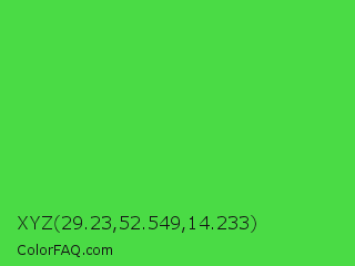 XYZ 29.23,52.549,14.233 Color is a normal green color and the nearest color is Lime Green #32cd32. Hex code #4adb45 and RGB value is rgb(74,219,69). In RGB color space, this color is composed of 29% red, 86% green, 27% blue, In CMYK color space, this color is composed of 66% cyan, 0% magenta, 68% yellow , 14% black , In HSL color space, this color has a hue angle of 118° , 68% saturation and 56% lightness.