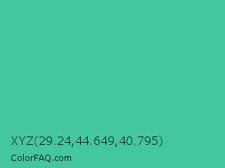XYZ 29.24,44.649,40.795 Color is a normal green color and the nearest color is Puerto Rico #3fc1aa. Hex code #44c7a1 and RGB value is rgb(68,199,161). In RGB color space, this color is composed of 27% red, 78% green, 63% blue, In CMYK color space, this color is composed of 66% cyan, 0% magenta, 19% yellow , 22% black , In HSL color space, this color has a hue angle of 163° , 54% saturation and 52% lightness.