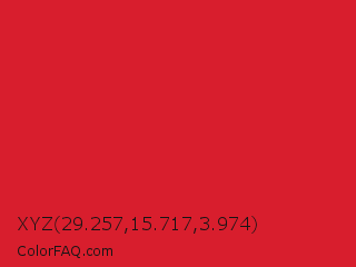 XYZ 29.257,15.717,3.974 Color is a normal red color and the nearest color is Amaranth Red #d3212d. Hex code #d81e2d and RGB value is rgb(216,30,45). In RGB color space, this color is composed of 85% red, 12% green, 18% blue, In CMYK color space, this color is composed of 0% cyan, 86% magenta, 79% yellow , 15% black , In HSL color space, this color has a hue angle of 355° , 76% saturation and 48% lightness.