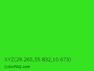 XYZ 29.265,55.832,10.673 Color is a normal green color and the nearest color is Lime Green #32cd32. Hex code #36e321 and RGB value is rgb(54,227,33). In RGB color space, this color is composed of 21% red, 89% green, 13% blue, In CMYK color space, this color is composed of 76% cyan, 0% magenta, 85% yellow , 11% black , In HSL color space, this color has a hue angle of 114° , 78% saturation and 51% lightness.