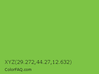 XYZ 29.272,44.27,12.632 Color is a normal green color and the nearest color is Sushi #87ab39. Hex code #7dc445 and RGB value is rgb(125,196,69). In RGB color space, this color is composed of 49% red, 77% green, 27% blue, In CMYK color space, this color is composed of 36% cyan, 0% magenta, 65% yellow , 23% black , In HSL color space, this color has a hue angle of 94° , 52% saturation and 52% lightness.