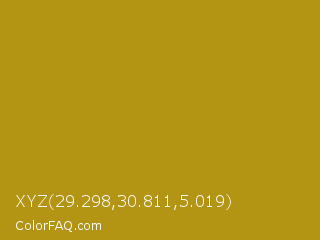 XYZ 29.298,30.811,5.019 Color is a normal yellow color and the nearest color is Sahara #b7a214. Hex code #b39413 and RGB value is rgb(179,148,19). In RGB color space, this color is composed of 70% red, 58% green, 7% blue, In CMYK color space, this color is composed of 0% cyan, 17% magenta, 89% yellow , 30% black , In HSL color space, this color has a hue angle of 48° , 81% saturation and 39% lightness.