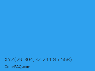 XYZ 29.304,32.244,85.568 Color is a normal blue color and the nearest color is Button Blue #24a0ed. Hex code #2ea1ee and RGB value is rgb(46,161,238). In RGB color space, this color is composed of 18% red, 63% green, 93% blue, In CMYK color space, this color is composed of 81% cyan, 32% magenta, 0% yellow , 7% black , In HSL color space, this color has a hue angle of 204° , 85% saturation and 56% lightness.