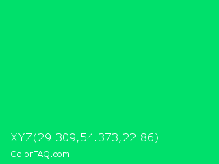 XYZ 29.309,54.373,22.86 Color is a normal green color and the nearest color is Malachite #0bda51. Hex code #00e06b and RGB value is rgb(0,224,107). In RGB color space, this color is composed of 0% red, 88% green, 42% blue, In CMYK color space, this color is composed of 100% cyan, 0% magenta, 52% yellow , 12% black , In HSL color space, this color has a hue angle of 149° , 100% saturation and 44% lightness.