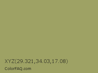 XYZ 29.321,34.03,17.08 Color is a normal yellow color and the nearest color is Green Smoke #a4af6e. Hex code #9ea264 and RGB value is rgb(158,162,100). In RGB color space, this color is composed of 62% red, 64% green, 39% blue, In CMYK color space, this color is composed of 2% cyan, 0% magenta, 38% yellow , 36% black , In HSL color space, this color has a hue angle of 64° , 25% saturation and 51% lightness.