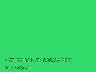 XYZ 29.321,52.808,22.283 Color is a normal green color and the nearest color is UFO Green #3cd070. Hex code #2edc6a and RGB value is rgb(46,220,106). In RGB color space, this color is composed of 18% red, 86% green, 42% blue, In CMYK color space, this color is composed of 79% cyan, 0% magenta, 52% yellow , 14% black , In HSL color space, this color has a hue angle of 141° , 71% saturation and 52% lightness.