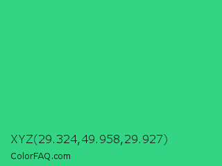 XYZ 29.324,49.958,29.927 Color is a normal green color and the nearest color is UFO Green #3cd070. Hex code #33d584 and RGB value is rgb(51,213,132). In RGB color space, this color is composed of 20% red, 84% green, 52% blue, In CMYK color space, this color is composed of 76% cyan, 0% magenta, 38% yellow , 16% black , In HSL color space, this color has a hue angle of 150° , 66% saturation and 52% lightness.