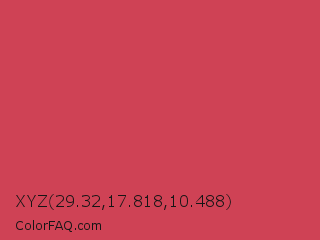 XYZ 29.32,17.818,10.488 Color is a normal red color and the nearest color is Brick Red #cb4154. Hex code #cf4255 and RGB value is rgb(207,66,85). In RGB color space, this color is composed of 81% red, 26% green, 33% blue, In CMYK color space, this color is composed of 0% cyan, 68% magenta, 59% yellow , 19% black , In HSL color space, this color has a hue angle of 352° , 59% saturation and 54% lightness.