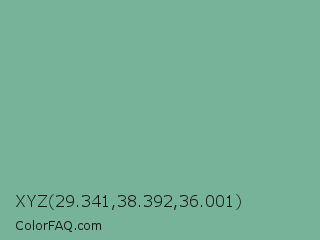 XYZ 29.341,38.392,36.001 Color is a normal green color and the nearest color is Acapulco #7cb0a1. Hex code #76b399 and RGB value is rgb(118,179,153). In RGB color space, this color is composed of 46% red, 70% green, 60% blue, In CMYK color space, this color is composed of 34% cyan, 0% magenta, 15% yellow , 30% black , In HSL color space, this color has a hue angle of 154° , 29% saturation and 58% lightness.