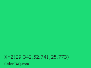 XYZ 29.342,52.741,25.773 Color is a normal green color and the nearest color is UFO Green #3cd070. Hex code #1cdc76 and RGB value is rgb(28,220,118). In RGB color space, this color is composed of 11% red, 86% green, 46% blue, In CMYK color space, this color is composed of 87% cyan, 0% magenta, 46% yellow , 14% black , In HSL color space, this color has a hue angle of 148° , 77% saturation and 49% lightness.