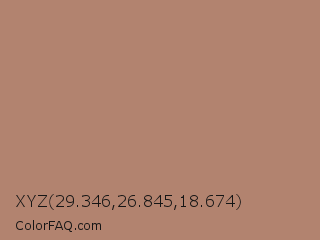 XYZ 29.346,26.845,18.674 Color is a normal orange color and the nearest color is Light Taupe #b38b6d. Hex code #b2836f and RGB value is rgb(178,131,111). In RGB color space, this color is composed of 70% red, 51% green, 44% blue, In CMYK color space, this color is composed of 0% cyan, 26% magenta, 38% yellow , 30% black , In HSL color space, this color has a hue angle of 18° , 30% saturation and 57% lightness.