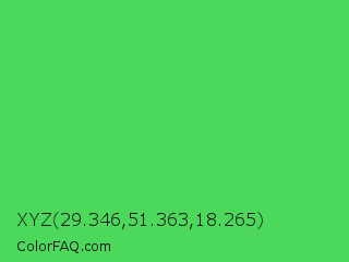 XYZ 29.346,51.363,18.265 Color is a normal green color and the nearest color is UFO Green #3cd070. Hex code #4bd85b and RGB value is rgb(75,216,91). In RGB color space, this color is composed of 29% red, 85% green, 36% blue, In CMYK color space, this color is composed of 65% cyan, 0% magenta, 58% yellow , 15% black , In HSL color space, this color has a hue angle of 127° , 64% saturation and 57% lightness.