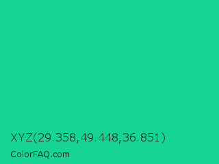 XYZ 29.358,49.448,36.851 Color is a normal green color and the nearest color is Caribbean Green #00cc99. Hex code #15d496 and RGB value is rgb(21,212,150). In RGB color space, this color is composed of 8% red, 83% green, 59% blue, In CMYK color space, this color is composed of 90% cyan, 0% magenta, 29% yellow , 17% black , In HSL color space, this color has a hue angle of 161° , 82% saturation and 46% lightness.