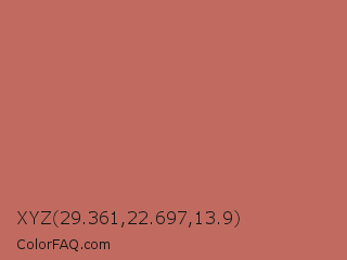 XYZ 29.361,22.697,13.9 Color is a normal red color and the nearest color is Fuzzy Wuzzy #cc6666. Hex code #c16b60 and RGB value is rgb(193,107,96). In RGB color space, this color is composed of 76% red, 42% green, 38% blue, In CMYK color space, this color is composed of 0% cyan, 45% magenta, 50% yellow , 24% black , In HSL color space, this color has a hue angle of 7° , 44% saturation and 57% lightness.