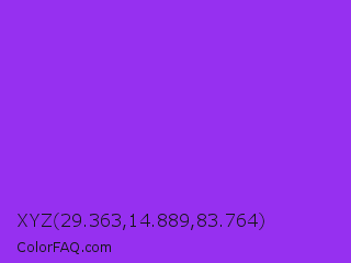 XYZ 29.363,14.889,83.764 Color is a normal purple color and the nearest color is Veronica #a020f0. Hex code #9630f0 and RGB value is rgb(150,48,240). In RGB color space, this color is composed of 59% red, 19% green, 94% blue, In CMYK color space, this color is composed of 38% cyan, 80% magenta, 0% yellow , 6% black , In HSL color space, this color has a hue angle of 272° , 86% saturation and 56% lightness.