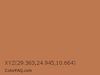 XYZ 29.363,24.945,10.664 Color is a normal orange color and the nearest color is Copper Red #cb6d51. Hex code #be784f and RGB value is rgb(190,120,79). In RGB color space, this color is composed of 75% red, 47% green, 31% blue, In CMYK color space, this color is composed of 0% cyan, 37% magenta, 58% yellow , 25% black , In HSL color space, this color has a hue angle of 22° , 46% saturation and 53% lightness.