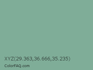 XYZ 29.363,36.666,35.235 Color is a normal green color and the nearest color is Acapulco #7cb0a1. Hex code #7fad98 and RGB value is rgb(127,173,152). In RGB color space, this color is composed of 50% red, 68% green, 60% blue, In CMYK color space, this color is composed of 27% cyan, 0% magenta, 12% yellow , 32% black , In HSL color space, this color has a hue angle of 153° , 22% saturation and 59% lightness.