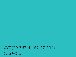 XYZ 29.365,41.67,57.534 Color is a normal cyan color and the nearest color is Maximum Blue Green #30bfbf. Hex code #2bbfc2 and RGB value is rgb(43,191,194). In RGB color space, this color is composed of 17% red, 75% green, 76% blue, In CMYK color space, this color is composed of 78% cyan, 2% magenta, 0% yellow , 24% black , In HSL color space, this color has a hue angle of 181° , 64% saturation and 46% lightness.