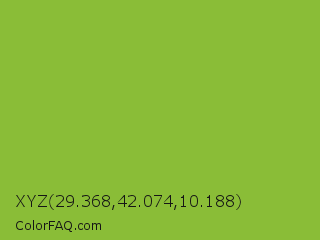 XYZ 29.368,42.074,10.188 Color is a normal green color and the nearest color is Sushi #87ab39. Hex code #8abd37 and RGB value is rgb(138,189,55). In RGB color space, this color is composed of 54% red, 74% green, 22% blue, In CMYK color space, this color is composed of 27% cyan, 0% magenta, 71% yellow , 26% black , In HSL color space, this color has a hue angle of 83° , 55% saturation and 48% lightness.