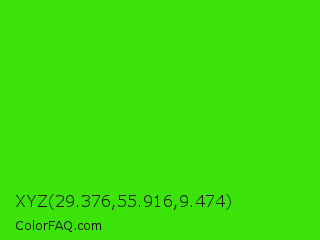 XYZ 29.376,55.916,9.474 Color is a normal green color and the nearest color is Harlequin #3fff00. Hex code #3ce308 and RGB value is rgb(60,227,8). In RGB color space, this color is composed of 24% red, 89% green, 3% blue, In CMYK color space, this color is composed of 74% cyan, 0% magenta, 96% yellow , 11% black , In HSL color space, this color has a hue angle of 106° , 93% saturation and 46% lightness.