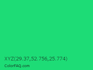 XYZ 29.37,52.756,25.774 Color is a normal green color and the nearest color is UFO Green #3cd070. Hex code #1ddc76 and RGB value is rgb(29,220,118). In RGB color space, this color is composed of 11% red, 86% green, 46% blue, In CMYK color space, this color is composed of 87% cyan, 0% magenta, 46% yellow , 14% black , In HSL color space, this color has a hue angle of 148° , 77% saturation and 49% lightness.