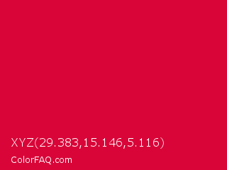XYZ 29.383,15.146,5.116 Color is a normal red color and the nearest color is Rich Carmine #d70040. Hex code #d90538 and RGB value is rgb(217,5,56). In RGB color space, this color is composed of 85% red, 2% green, 22% blue, In CMYK color space, this color is composed of 0% cyan, 98% magenta, 74% yellow , 15% black , In HSL color space, this color has a hue angle of 346° , 95% saturation and 44% lightness.