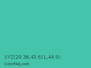 XYZ 29.38,43.611,44.9 Color is a normal cyan color and the nearest color is Puerto Rico #3fc1aa. Hex code #44c4aa and RGB value is rgb(68,196,170). In RGB color space, this color is composed of 27% red, 77% green, 67% blue, In CMYK color space, this color is composed of 65% cyan, 0% magenta, 13% yellow , 23% black , In HSL color space, this color has a hue angle of 168° , 52% saturation and 52% lightness.