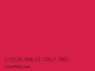 XYZ 29.398,15.706,7.785 Color is a normal red color and the nearest color is Rusty Red #da2c43. Hex code #d61e49 and RGB value is rgb(214,30,73). In RGB color space, this color is composed of 84% red, 12% green, 29% blue, In CMYK color space, this color is composed of 0% cyan, 86% magenta, 66% yellow , 16% black , In HSL color space, this color has a hue angle of 346° , 75% saturation and 48% lightness.