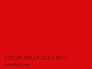 XYZ 29.408,15.312,1.857 Color is a normal red color and the nearest color is KU Crimson #e8000d. Hex code #db0a0f and RGB value is rgb(219,10,15). In RGB color space, this color is composed of 86% red, 4% green, 6% blue, In CMYK color space, this color is composed of 0% cyan, 95% magenta, 93% yellow , 14% black , In HSL color space, this color has a hue angle of 359° , 91% saturation and 45% lightness.