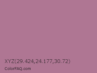 XYZ 29.424,24.177,30.72 Color is a normal rose color and the nearest color is English Lavender #b48395. Hex code #af7693 and RGB value is rgb(175,118,147). In RGB color space, this color is composed of 69% red, 46% green, 58% blue, In CMYK color space, this color is composed of 0% cyan, 33% magenta, 16% yellow , 31% black , In HSL color space, this color has a hue angle of 329° , 26% saturation and 57% lightness.