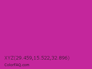 XYZ 29.459,15.522,32.896 Color is a normal magenta color and the nearest color is Royal Fuchsia #ca2c92. Hex code #c4269c and RGB value is rgb(196,38,156). In RGB color space, this color is composed of 77% red, 15% green, 61% blue, In CMYK color space, this color is composed of 0% cyan, 81% magenta, 20% yellow , 23% black , In HSL color space, this color has a hue angle of 315° , 68% saturation and 46% lightness.