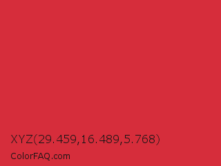 XYZ 29.459,16.489,5.768 Color is a normal red color and the nearest color is Rusty Red #da2c43. Hex code #d62d3b and RGB value is rgb(214,45,59). In RGB color space, this color is composed of 84% red, 18% green, 23% blue, In CMYK color space, this color is composed of 0% cyan, 79% magenta, 72% yellow , 16% black , In HSL color space, this color has a hue angle of 355° , 67% saturation and 51% lightness.